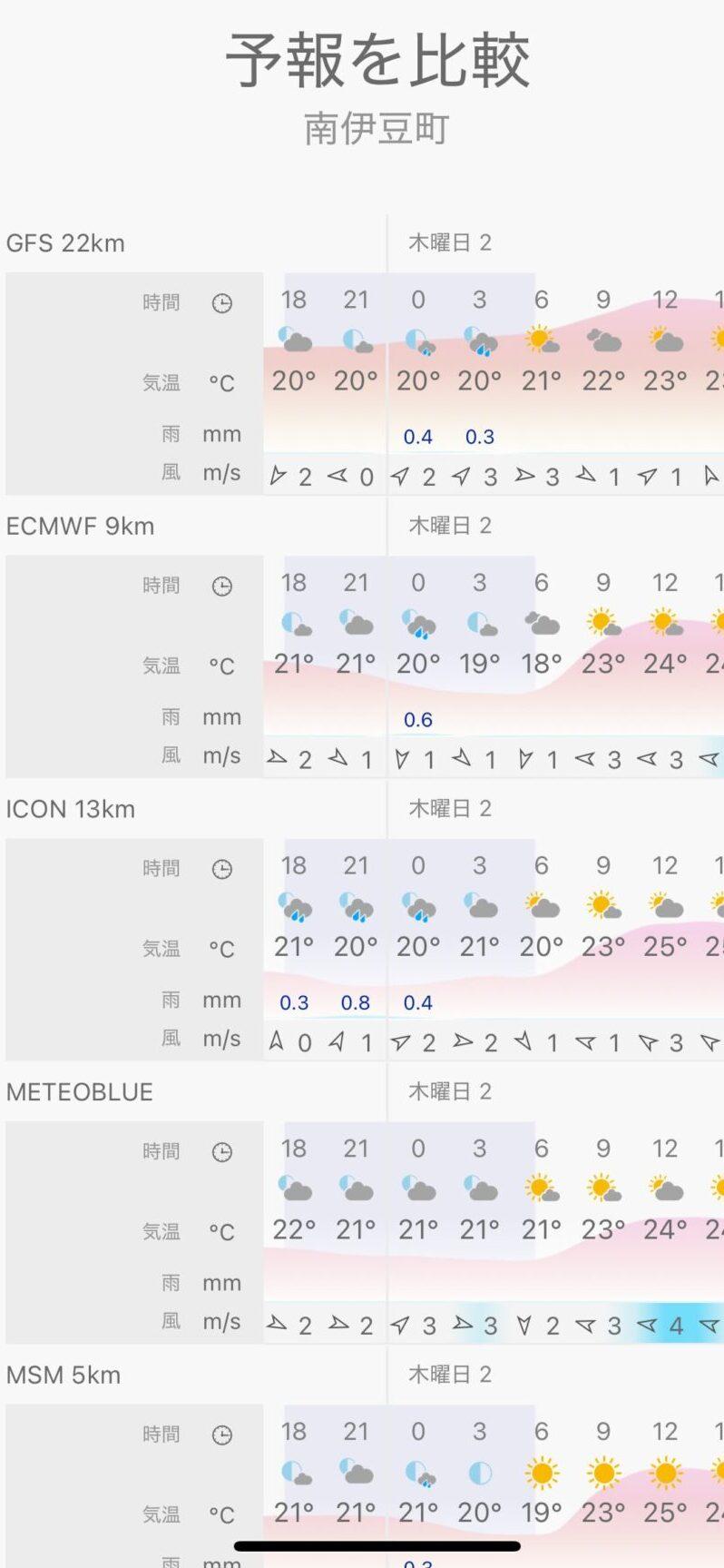 加えて、無料版でも5つの気象モデルが確認比較できるため私が最も重宝しているアプリです!